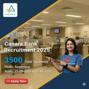 Canara Bank Apprentice Recruitment 2025 is for 3,500 Graduate Apprentices offering one-year training to gain banking experience. Graduates aged 20–28 years with local language proficiency are eligible. Selection is merit-based with possible language test and document verification. Stipend is ₹15,000/month. Apply online from 23rd September to 12th October 2025 via the Canara Bank website after NATS registration.